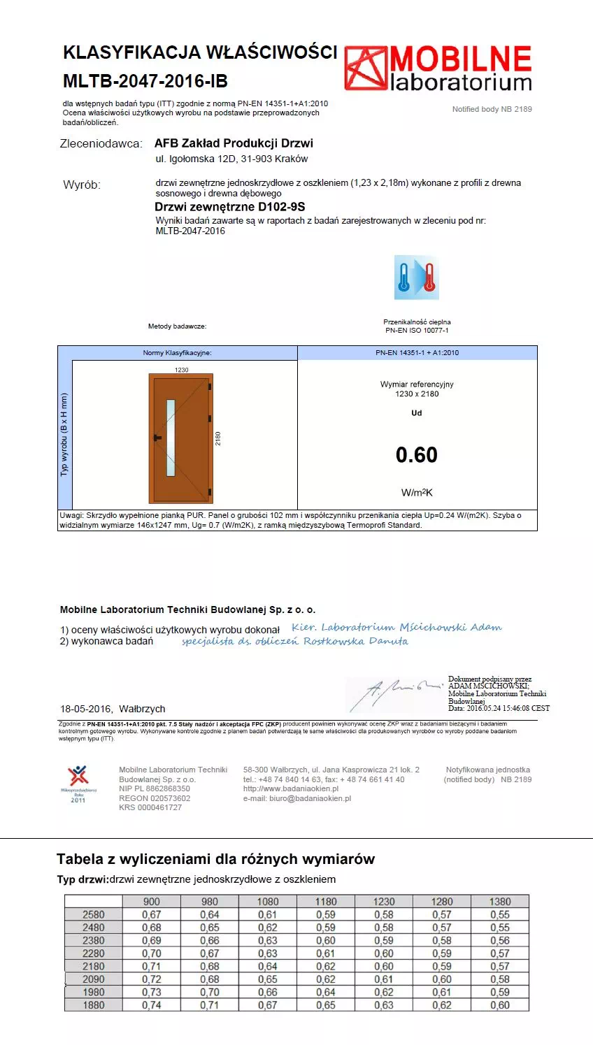 18. Deklaracja właściwości użytkowych dla drzwi zewnętrznych szklonych z drewna mahoń-meranti typu M102