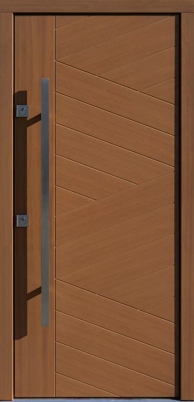 Ten model drzwi antywłamaniowych może zostać wykonany z drewna mahoń-meranti lub dębowego o usłojeniu flader lub fryz. Powyższy, przykładowy egzemplarz drzwi zewnętrznych został wymalowany na kolor: winchester.