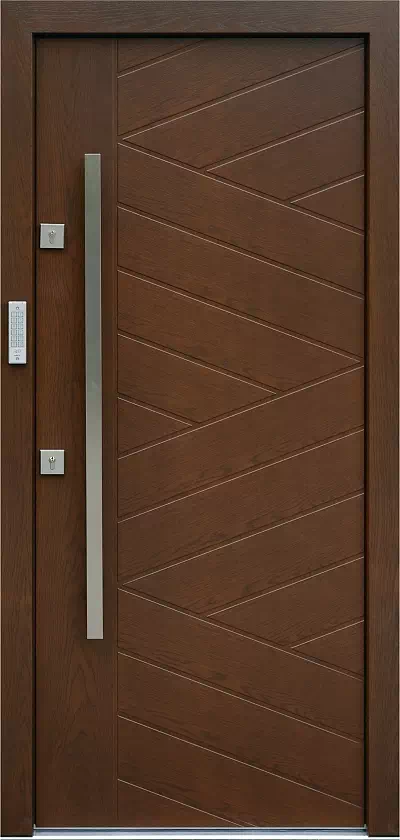 Model ten jest stylizowany na stare, tradycyjne drzwi wyprodukowane w technologi ciesielskiej. Powyższy, przykładowy egzemplarz drzwi zewnętrznych został wymalowany na kolor: orzech.
