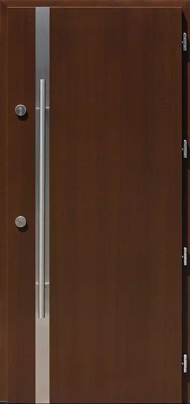 Pasek ze stali inox może rozdzielać połączenie dwu kolorów wybarwienia zastosowanego na skrzydle tego wzoru drzwi. Powyższy, przykładowy egzemplarz drzwi zewnętrznych został wymalowany na kolor: orzech.