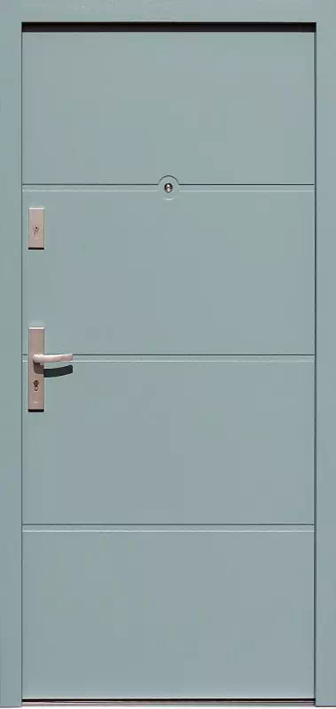 Pozostawiony jedynie został wizjer szerokokątny wraz z przyległym do niego wyfrezowanym okrągłym polem. Powyższy, przykładowy egzemplarz drzwi zewnętrznych został wymalowany na kolor: szare.