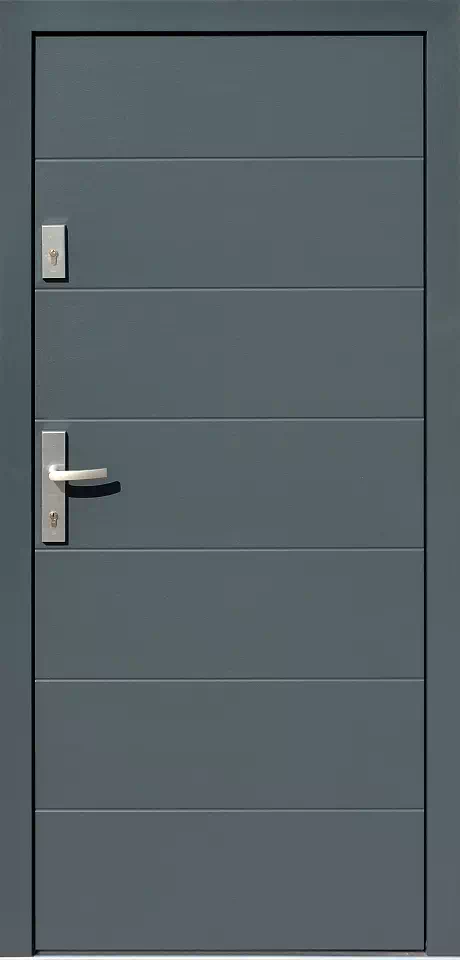Ilość przefrezowań oraz szerokość przerw pomiędzy nimi może być dowolnie zmieniana - może być nawet różna po obu stronach skrzydła. Powyższy, przykładowy egzemplarz drzwi zewnętrznych został wymalowany na kolor: antracyt.