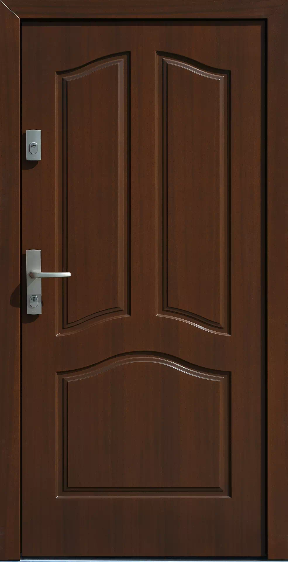Brak przeszkleń w tym modelu nie doświetli wnętrza za nimi, ale przyda domowi eleganckiego klasycznego stylu. Powyższy, przykładowy egzemplarz drzwi zewnętrznych został wymalowany na kolor: teak.