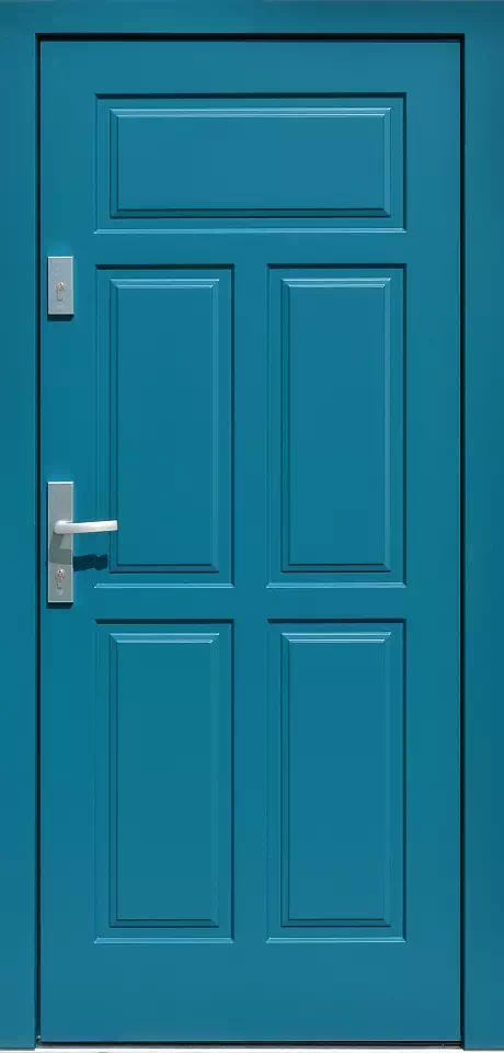 Pięć kasetonów o podobnej wielkości składa się na ten filunkowy model drzwi. Powyższy, przykładowy egzemplarz drzwi zewnętrznych został wymalowany na kolor: niebieskie.