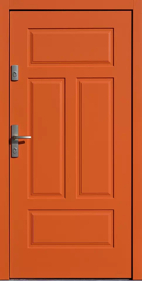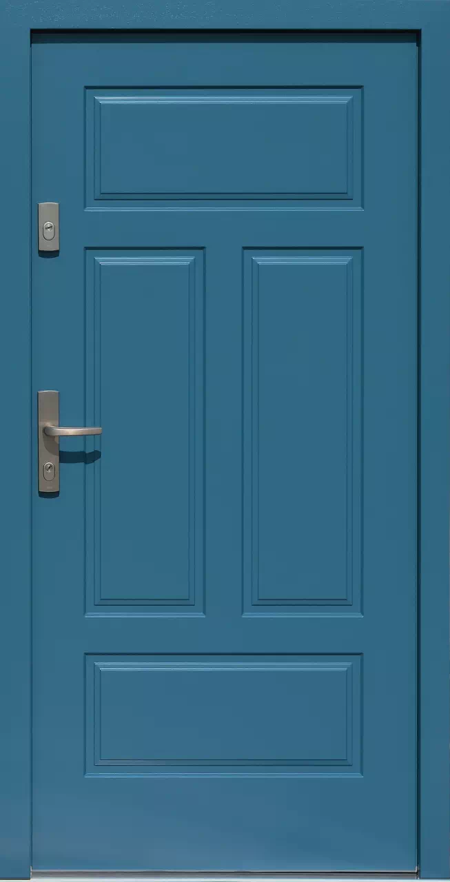 Cztery kasetony, dwa pionowe i dwa poziome, składa się na ten filunkowy model drzwi. Powyższy, przykładowy egzemplarz drzwi zewnętrznych został wymalowany na kolor: zielone.
