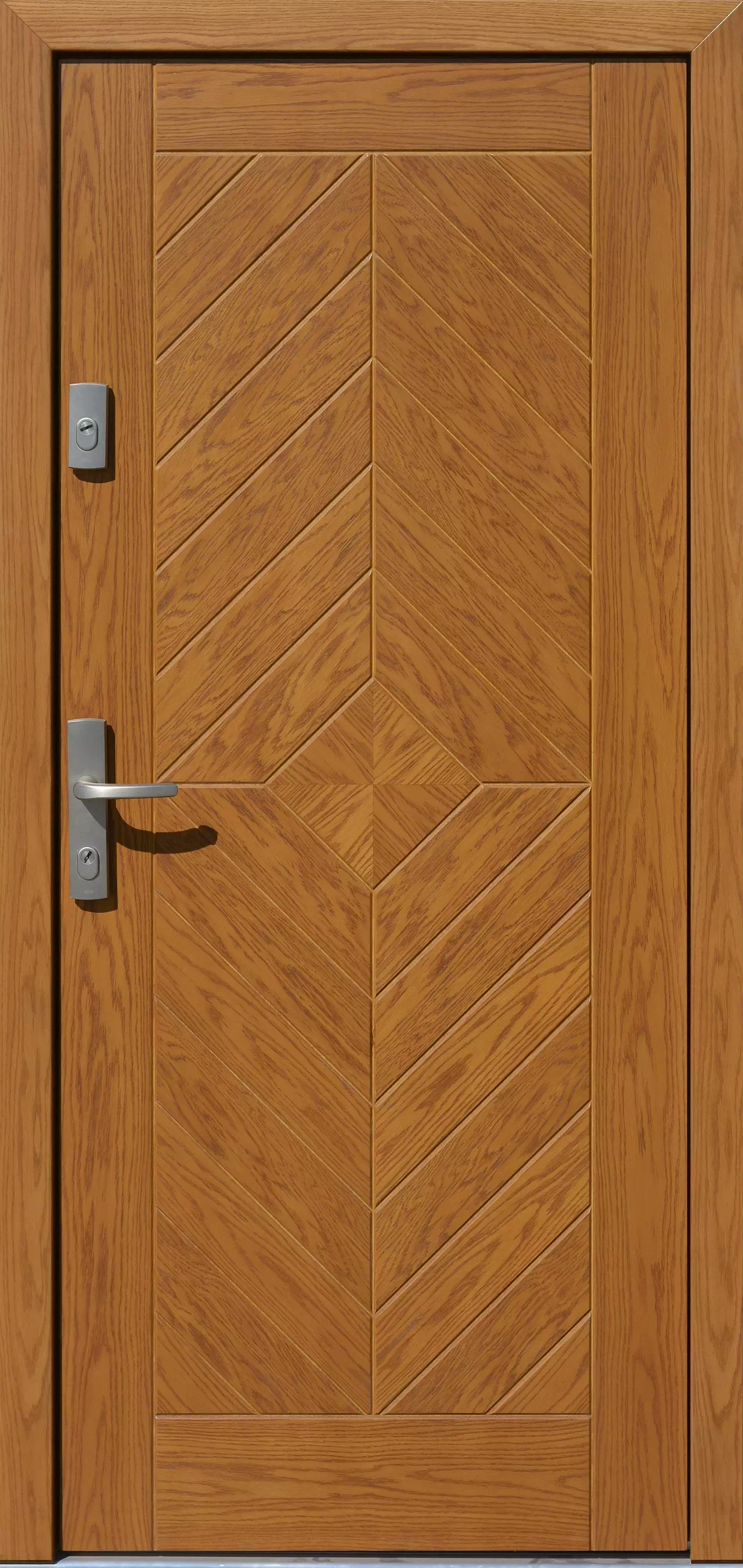 Ten wzór modelu drzwi antywłamaniowych oparty jest na skośnym układzie wąskich wąskich deseczek. Powyższy, przykładowy egzemplarz drzwi zewnętrznych został wymalowany na kolor: jasnt dąb.
