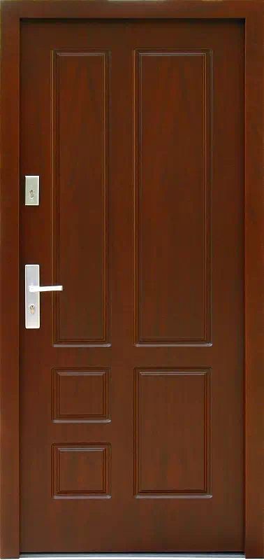 Klasyczne, prostokątne kasetony tego modelu drzwi antywłamaniowych tworzą regularna i schludną kompozycje artystyczną. Powyższy, przykładowy egzemplarz drzwi zewnętrznych został wymalowany na kolor: orzech.