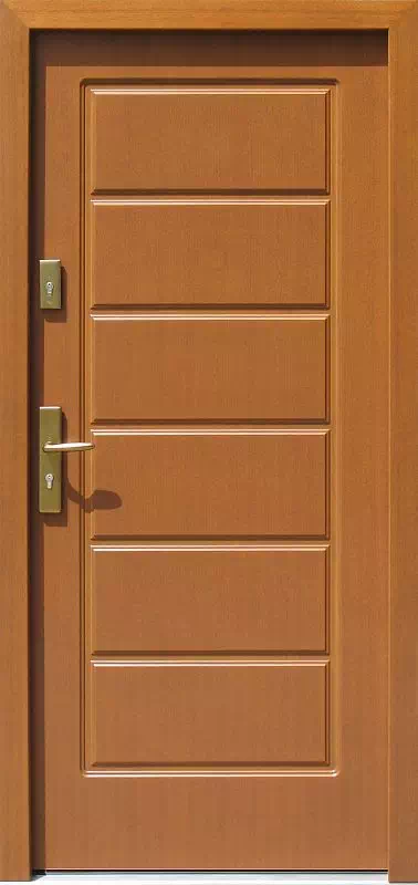 Ilość frezowanych , poziomych pasków na skrzydle może być zmieniona. W niewielkim zakresie może też być zmieniona ich szerokość. Powyższy, przykładowy egzemplarz drzwi zewnętrznych został wymalowany na kolor: złoty dąb.