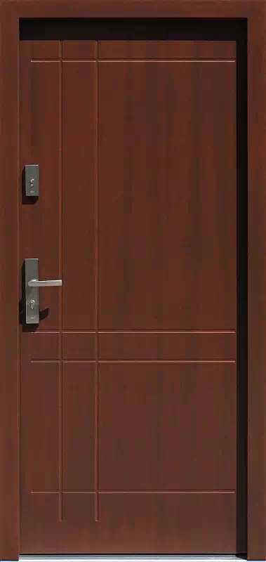 Kompozycja tego modelu to kilka pionowych i poziomych linii przecinających się prostopadle ze sobą. Powyższy, przykładowy egzemplarz drzwi zewnętrznych został wymalowany na kolor: teak.