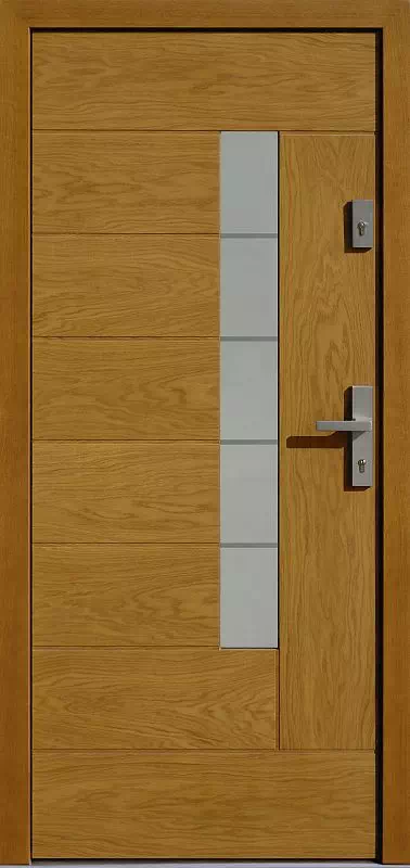 Standardowo pola pomiędzy paskami są matowe i nieprzezierne. Szerokość przeziernych pasków pasków wynosi 11 mm. Powyższy, przykładowy egzemplarz drzwi zewnętrznych został wymalowany na kolor: jasny dąb.