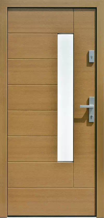 Dzięki takiemu rozwiązaniu, na tym modelu ograniczamy efekt lśnienia (zmiana koloru elementów drzwi z zalezności od miejsca ich oglądania. Powyższy, przykładowy egzemplarz drzwi zewnętrznych został wymalowany na kolor: winchester.