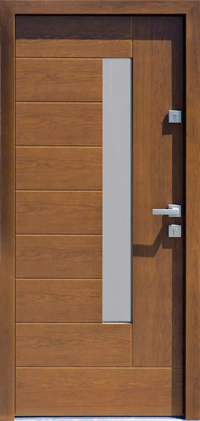 Przykładowy egzemplarz został wyprodukowany z drewna dębowego o usłojeniu flader (alternatywnie drzwi są dostępne w usłojeniu fryz). Powyższy, przykładowy egzemplarz drzwi zewnętrznych został wymalowany na kolor: złoty dąb.