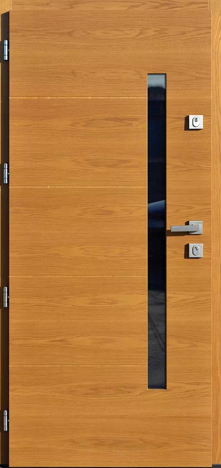 Przykładowy egzemplarz został wyprodukowany z drewna dębowego o usłojeniu fladrowym (alternatywnie dostępny w usłojeniu pionowym i z usłojeniem fryz). Powyższy, przykładowy egzemplarz drzwi zewnętrznych został wymalowany na kolor: jasny dąb.