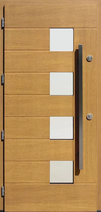 Sama kompozycja drzwi jest złożona z 9 poziomych i jednej pionowej "deski". Powyższy, przykładowy egzemplarz drzwi zewnętrznych został wymalowany na kolor: jasny dąb.