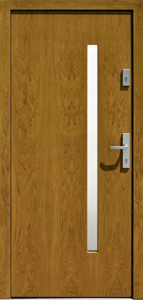 Natomiast jej szerokość możemy regulować w dosyć dużym zakresie. Powyższy, przykładowy egzemplarz drzwi zewnętrznych został wymalowany na kolor: złoty dąb.