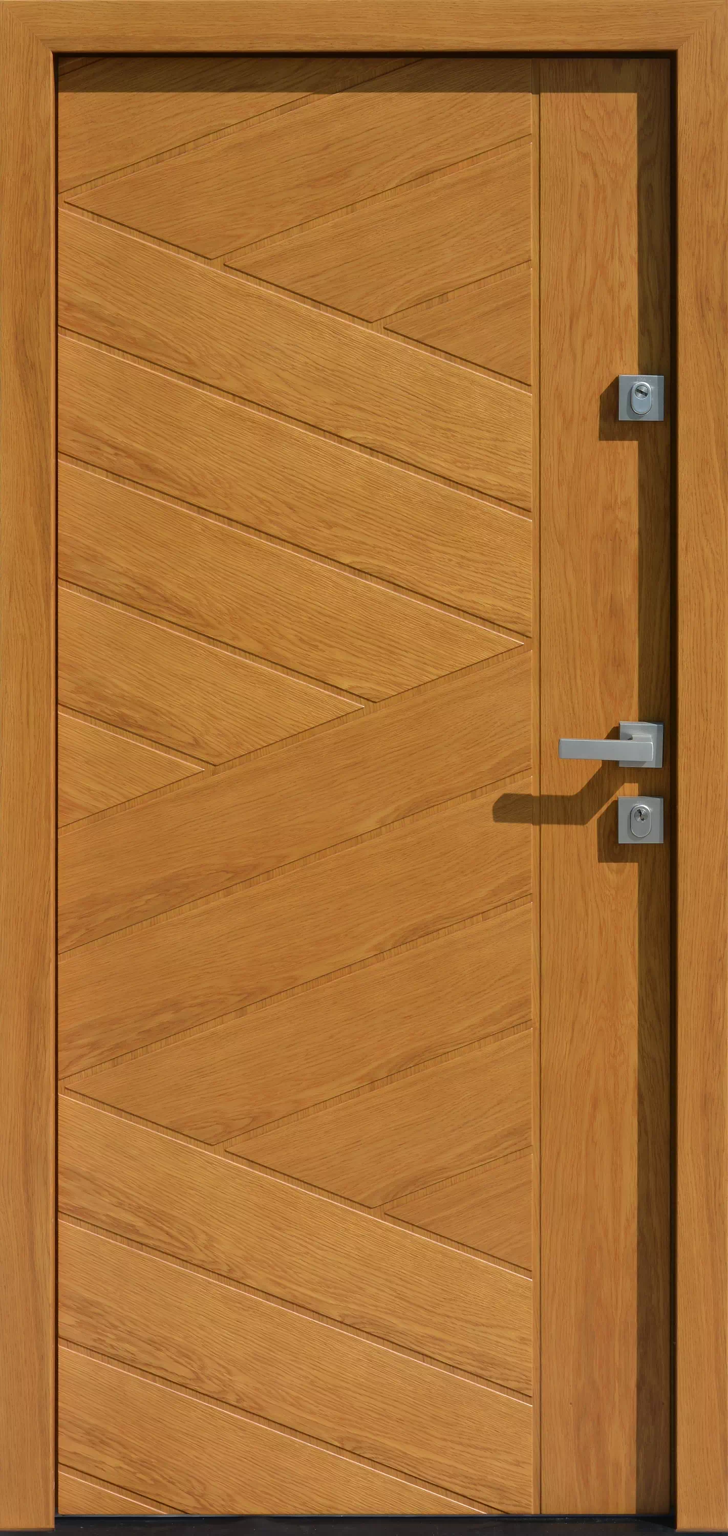 Relatywnie skomplikowany układ "klepek", z szerokimi szczelinami miedzy nimi, tworzą na skrzydle drzwiowym ciekawą, atrakcyjna w odbiorze kompozycje wzorniczą. Powyższy, przykładowy egzemplarz drzwi zewnętrznych został wymalowany na kolor: złoty dąb.