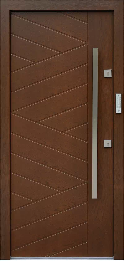 W tym modelu dębowych drzwi wejściowych zwiększyliśmy odstępy pomiędzy "deskami" do ok 14 mm. Powyższy, przykładowy egzemplarz drzwi zewnętrznych został wymalowany na kolor: orzech.