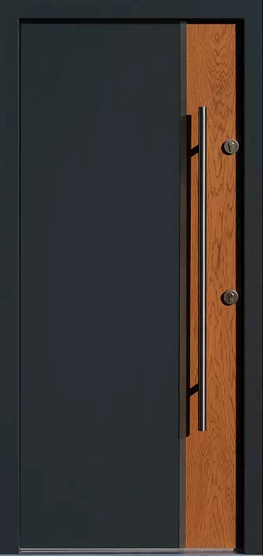 Kombinacje wybarwienia i szerokość pionowego płaskownika ze stali inox mogą być dopasowane do oczekiwań klienta. Powyższy, przykładowy egzemplarz drzwi zewnętrznych został wymalowany na kolor: antracyt+złoty dąb.