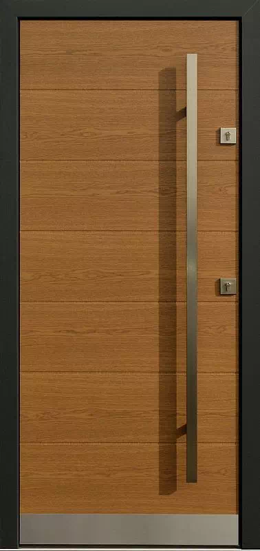 Ich ilość może być dowolnie modyfikowana. Należy jednak brać pod uwagę fakt że przy niektórych podziałach szczeliny pomiędzy "deseczkami" mogą nienajładniej wkomponować się układ szyldów klamek i rozet. Kopacz inox na dole skrzydła jest opcjonalny. Powyższy, przykładowy egzemplarz drzwi zewnętrznych został wymalowany na kolor: winchester + antracyt.