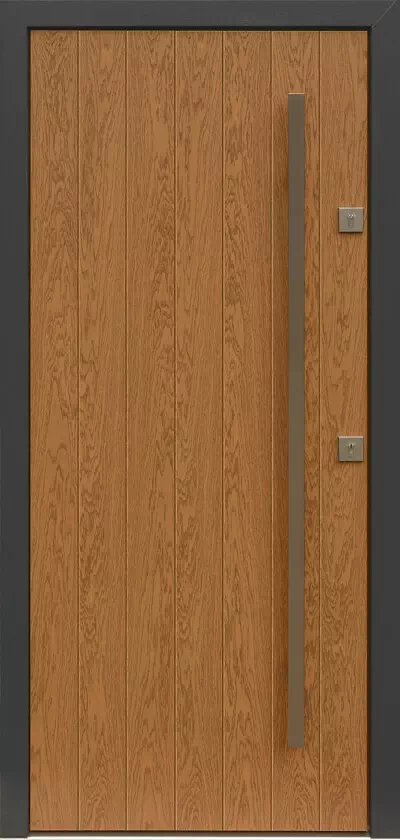 Drzwi te mogą być wyprodukowane z drewna dębowego o usłojeniu fryz lub flader. Powyższy, przykładowy egzemplarz drzwi zewnętrznych został wymalowany na kolor: winchester + antracyt.