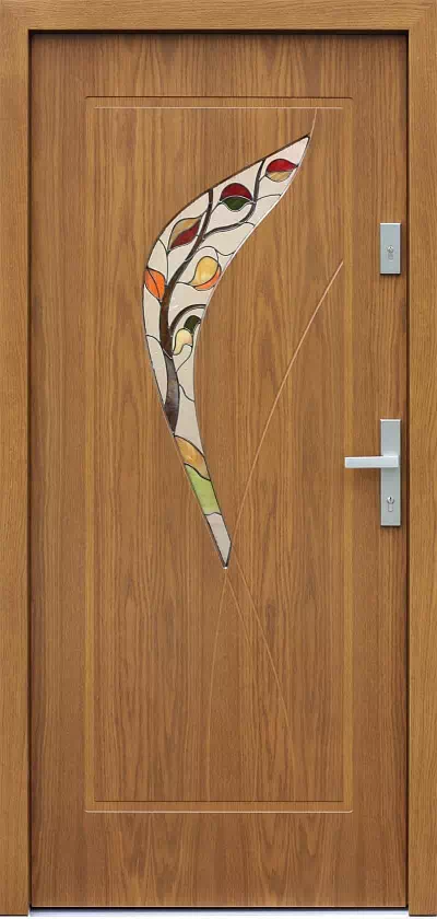Motyw roślinny samego witrażu ładnie komponuje się z nawiązującą do natury formą tego modelu dębowych drzwi zewnętrznych. Powyższy, przykładowy egzemplarz drzwi zewnętrznych został wymalowany na kolor: winchester.