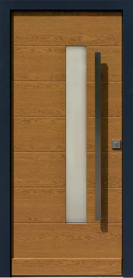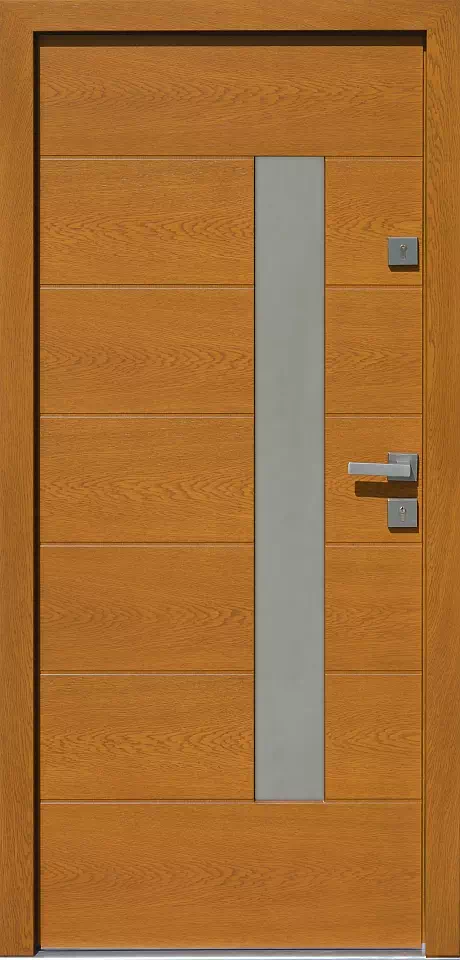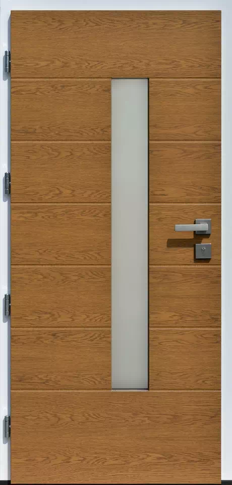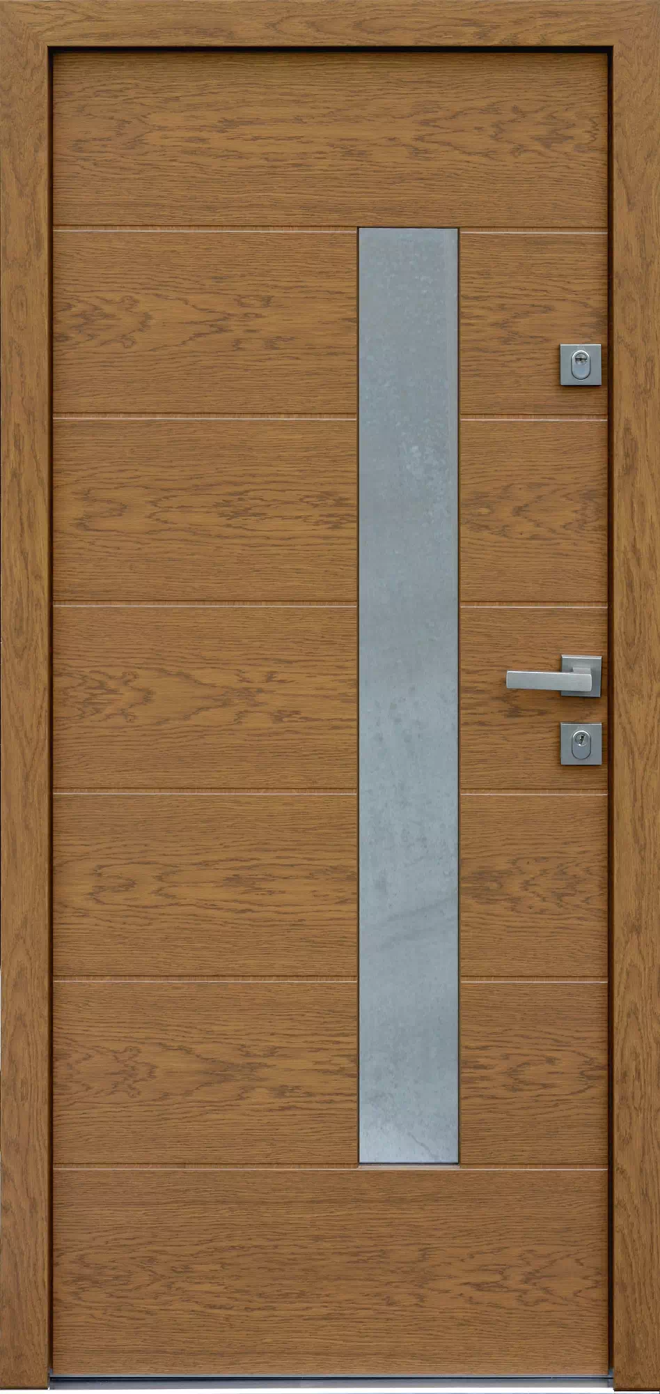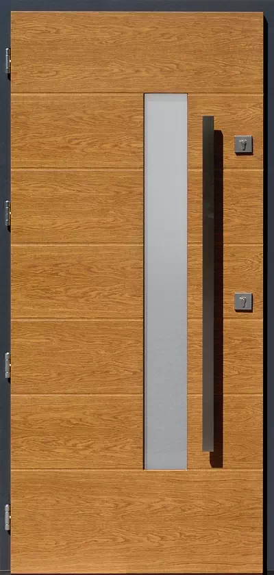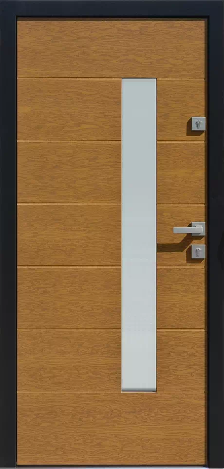 Szczególnie często jest zamawiany w wersji z przeszkloną dostawką boczną. Powyższy, przykładowy egzemplarz drzwi zewnętrznych został wymalowany na kolor: zloty dab + antracyt.