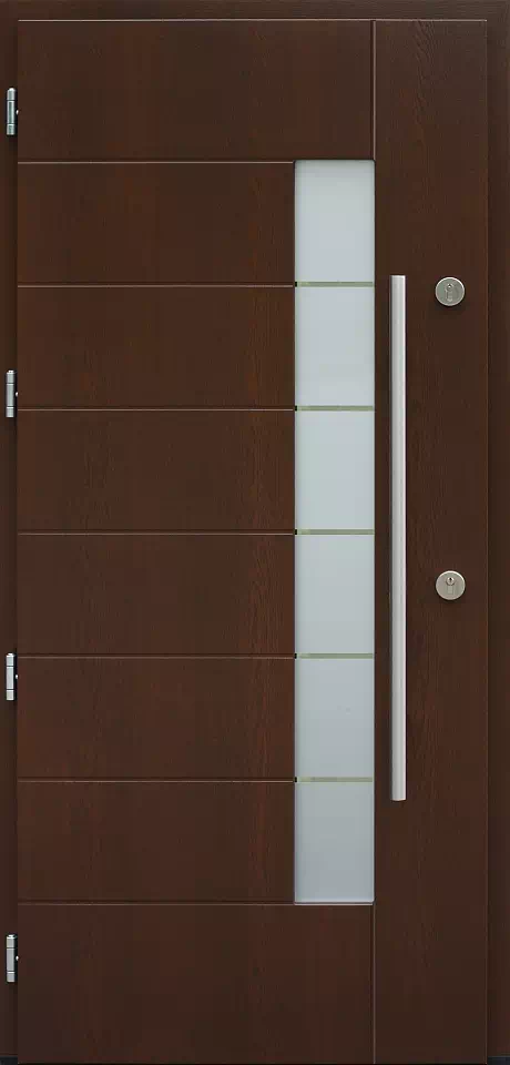 Poziome, paski są przyciemnione, lustrzane i przezierne od wewnątrz. Umożliwiają tym samym obserwacje zewnętrznego otoczenia domu. Powyższy, przykładowy egzemplarz drzwi zewnętrznych został wymalowany na kolor: orzech ciemny.