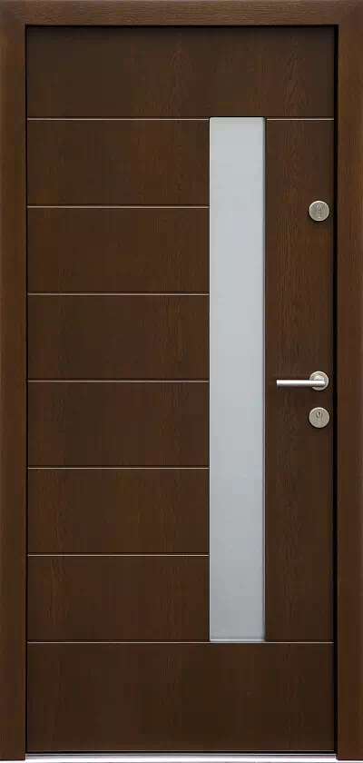 Ten model drzwi wejściowych może być wyprodukowany zarówno z drewna dębowego o usłojeniu fryz lub flader, a także z poziomym usłojeniem drewna. Powyższy, przykładowy egzemplarz drzwi zewnętrznych został wymalowany na kolor: orzech ciemny.