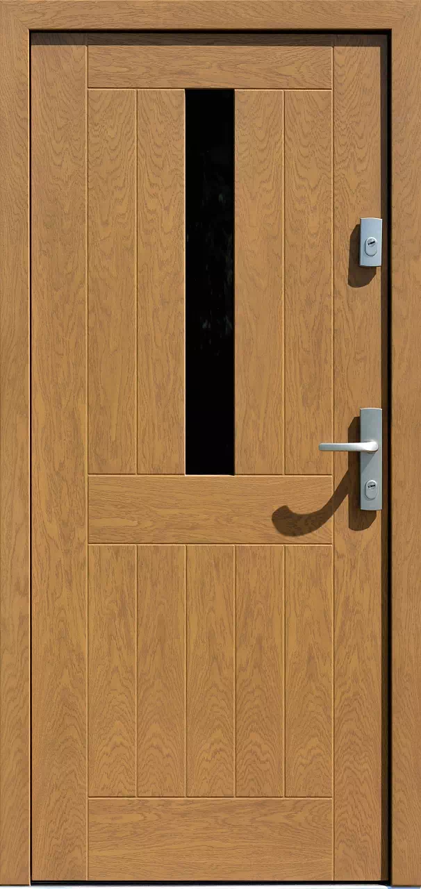 Ilość pionowych deseczek może być zmieniona i tym samym może być zmodyfikowana szerokość przeszklenia. Powyższy, przykładowy egzemplarz drzwi zewnętrznych został wymalowany na kolor: winchester.