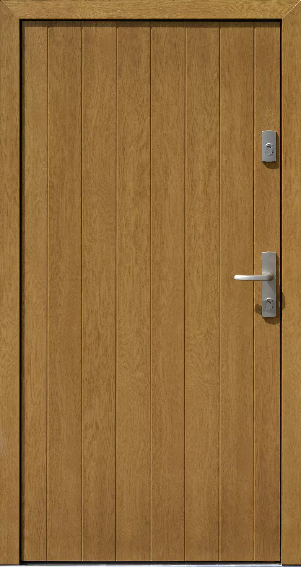 Możliwy jest wybór rysunku usłojenia drewna dębowego. Powyższy, przykładowy egzemplarz drzwi zewnętrznych został wymalowany na kolor: jasny dąb.