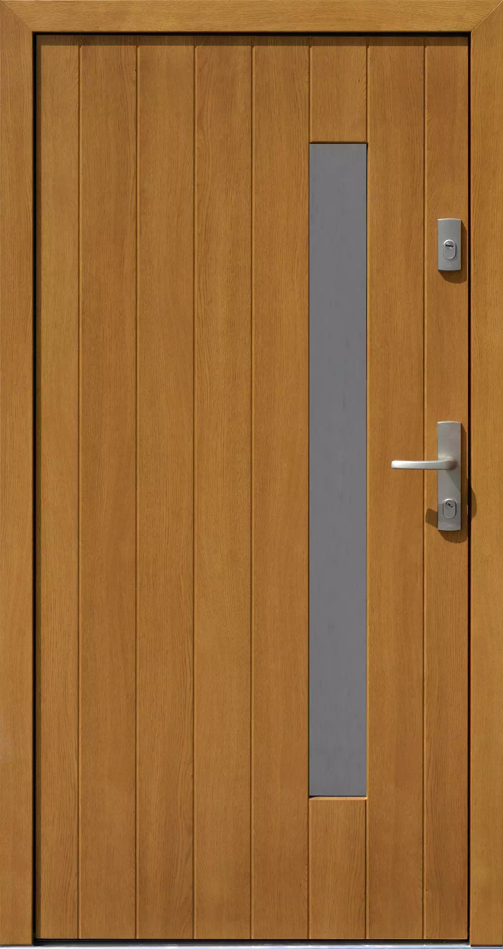Możliwy jest wybór rysunku usłojenia drewna dębowego - flader lub fryz. Powyższy, przykładowy egzemplarz drzwi zewnętrznych został wymalowany na kolor: jasny dąb.