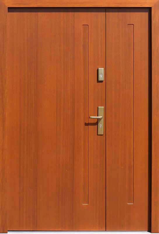 Podział wymiarowy obu skrzydeł w tym wzorze drzwi może być dokonany w bardzo szerokim zakresie wymiarów. Powyższy, przykładowy egzemplarz drzwi zewnętrznych został wymalowany na kolor: dąb ciemny.