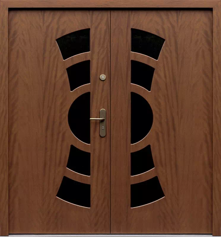 10 kształtowych szyb w tym zestawie drzwiowym jest rozmieszczona symetrycznie względem poziomej osi przechodzącą przez klamkę i pionowej na styku obu skrzydeł. Powyższy, przykładowy egzemplarz drzwi zewnętrznych został wymalowany na kolor: orzech.