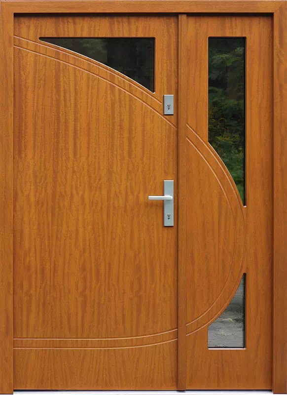 Wzór nie znalazł wielu końcowych klientów ale jest natchnieniem dla wielu autorów indywidualnych projektów które na co dzień realizujemy. Powyższy, przykładowy egzemplarz drzwi zewnętrznych został wymalowany na kolor: złoty dąb.