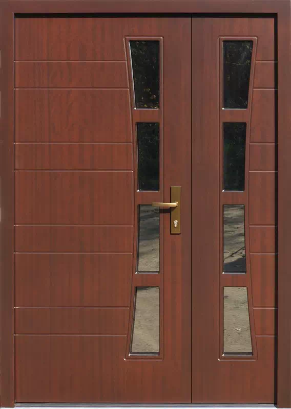 Szerokości poszczególnych frezów i ich rozstawy mogą być zmodyfikowane podobnie jak tez wymiary samych szyb. Powyższy, przykładowy egzemplarz drzwi zewnętrznych został wymalowany na kolor: orzech.