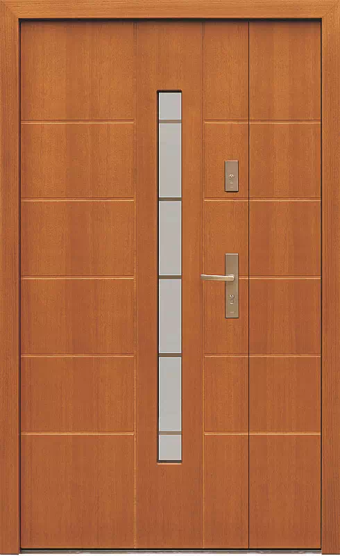 Dedykowany głównie do domów z wąskim otworem w ścianie i nie wymagających znaczącego doświetlenia wnętrza domu za nimi. Powyższy, przykładowy egzemplarz drzwi zewnętrznych został wymalowany na kolor: dąb średni.