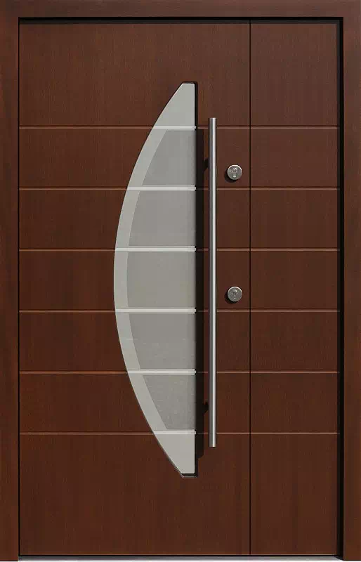 Zaprojektowany został do domów wymagających znaczącego doświetlenia wnętrza domu za nimi. Powyższy, przykładowy egzemplarz drzwi zewnętrznych został wymalowany na kolor: orzech.
