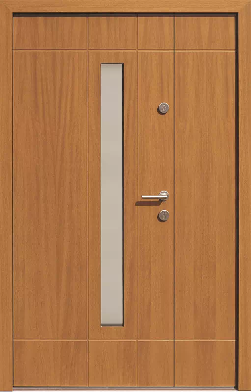 Dedykowany jest w szczególności do domów z wąskim otworem w ścianie. Powyższy, przykładowy egzemplarz drzwi zewnętrznych został wymalowany na kolor: dąb średni.