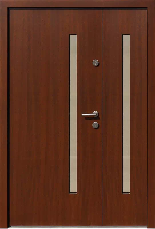 Dwie długie i wąskie szyby pełnią funkcję nie tyle ozdobną co doświetleniową i jednocześnie łamią monotonię gładkich powierzchni na obu skrzydłach drzwiowych. Powyższy, przykładowy egzemplarz drzwi zewnętrznych został wymalowany na kolor: orzech.
