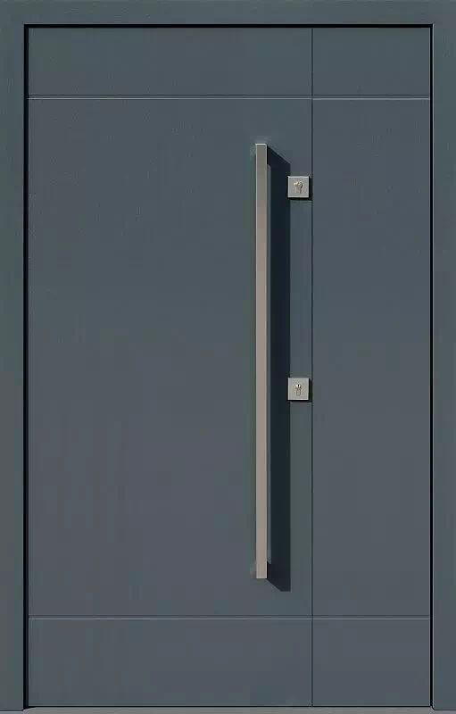 Proste wzornictwo jest cechą znamienną tego modelu drzwi dwuskrzydłowych. Powyższy, przykładowy egzemplarz drzwi zewnętrznych został wymalowany na kolor: antracyt.