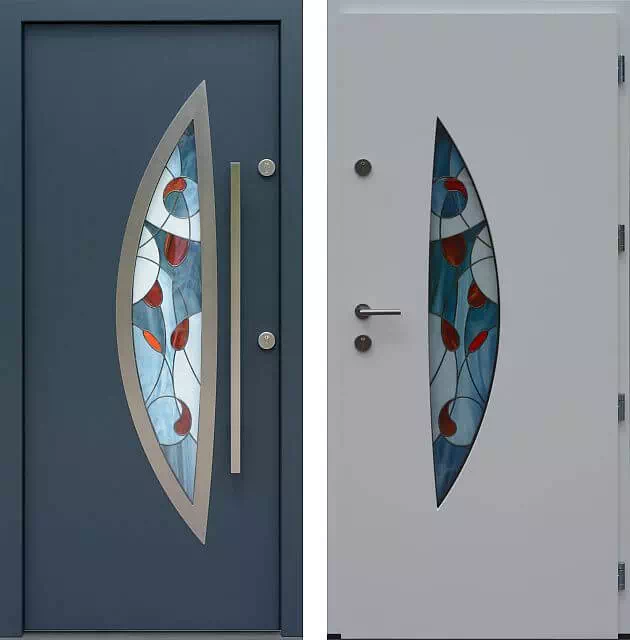 Witraż klasyczny nie jest tani ale efekt końcowy bardzo atrakcyjny wizualnie i przez długie lata będzie cieszył mieszkańców domu w którym będą zamontowane te drzwi. Powyższy, przykładowy egzemplarz drzwi zewnętrznych został wymalowany na kolor: antracyt + białe.