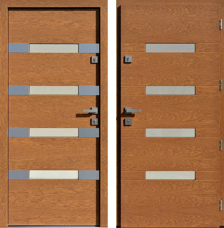 Opcjonalnie model może mieć zamontowane prostokątne blaszki ze stali nierdzewnej także od strony wewnętrznej skrzydła. Także opcjonalny jest kierunek i wzór okleiny drewnianej. Powyższy, przykładowy egzemplarz drzwi zewnętrznych został wymalowany na kolor: winchester.