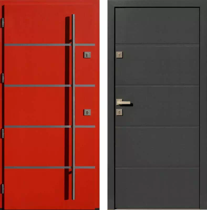 Zamiast wyfrezowanych rowków mogą być zamontowane także od strony wewnętrznej ozdobne paski ze stali szlachetnej INOX. Powyższy, przykładowy egzemplarz drzwi zewnętrznych został wymalowany na kolor: czerwone + antracyt.