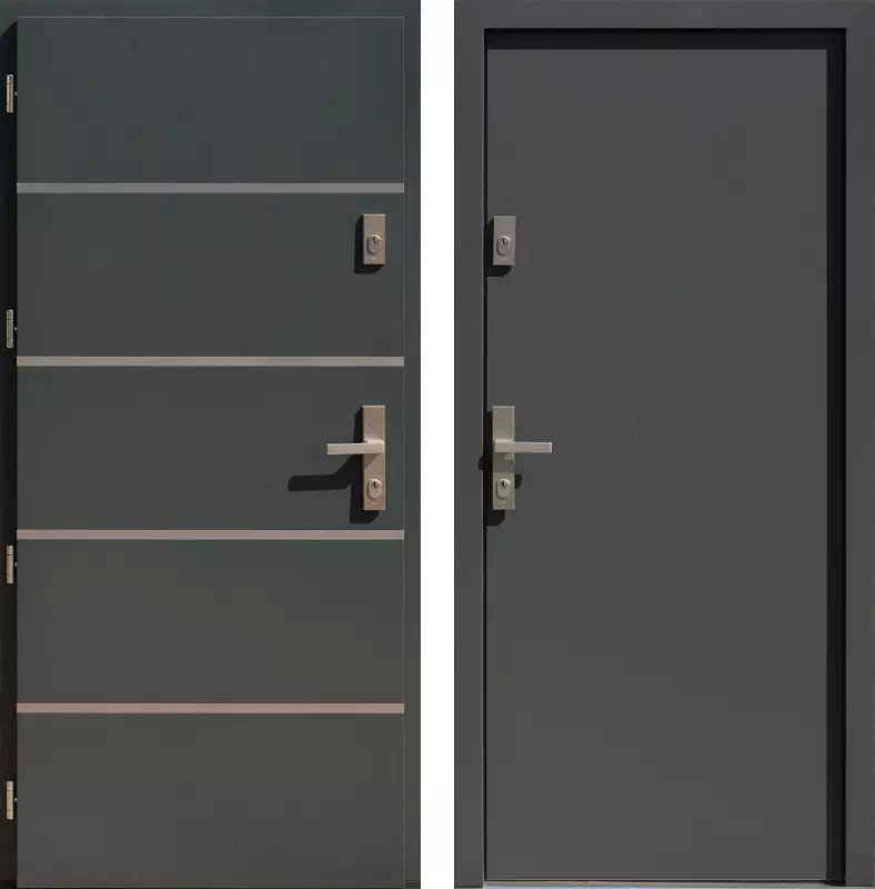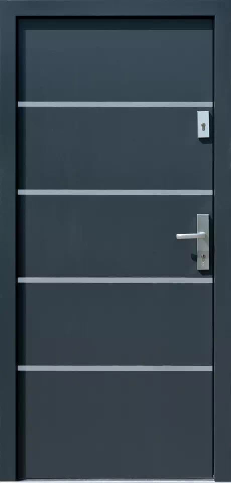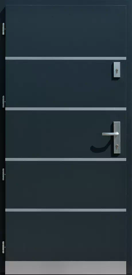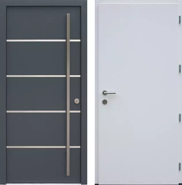 Wewnętrzna strona skrzydła może być gładka lub może mieć także przefrezowania o rozstawie i szerokościach identycznych jak wstawki stalowe od strony wewnętrznej. Powyższy, przykładowy egzemplarz drzwi zewnętrznych został wymalowany na kolor: antracytowe + białe.