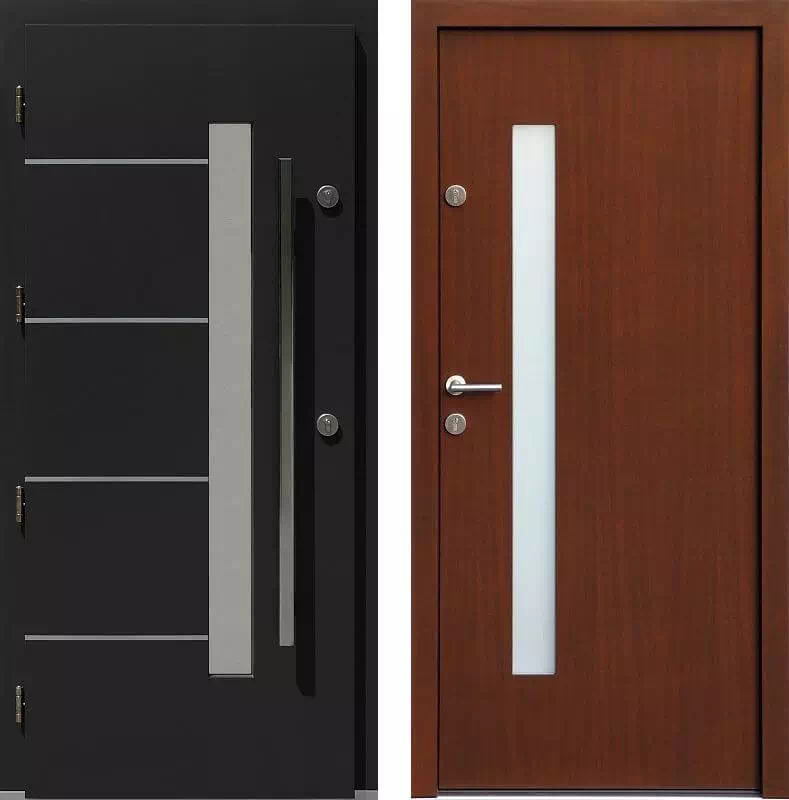 Szerokość pasków z blachy inox a także położenie i wymiary szyby mogą być modyfikowane w szerokim zakresie. Powyższy, przykładowy egzemplarz drzwi zewnętrznych został wymalowany na kolor: czarne + orzech.