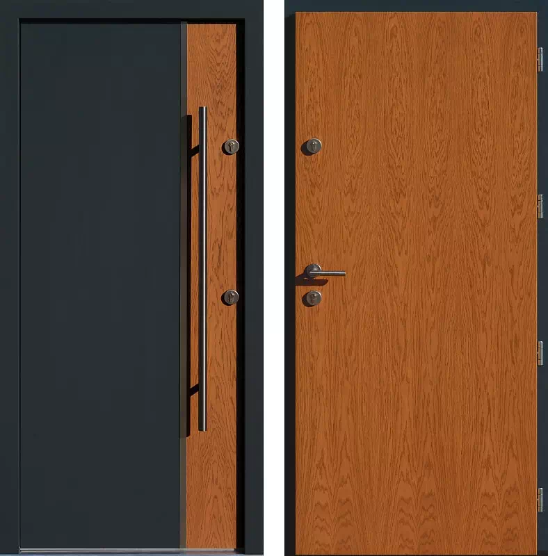 Przykładowy pochwyt rurowy zastosowany na tym przykładowym modelu, ale alternatywnie drzwi mogą być wyposażone w pochwyt do 200 cm i o innym przekroju niż okrągły. Aplikacja ze stali nierdzewnej zastosowana w tym modelu drzwi zewnętrznych sugeruje zastosowanie klamek z szczotkowanej stali szlachetnej. Drzwi przeznaczone do zabudowy w domach jednorodzinnych, mieszkaniach i budynkach użyteczności publicznej. Powyższy, przykładowy egzemplarz drzwi zewnętrznych został wymalowany na kolor: winchester + antracyt.