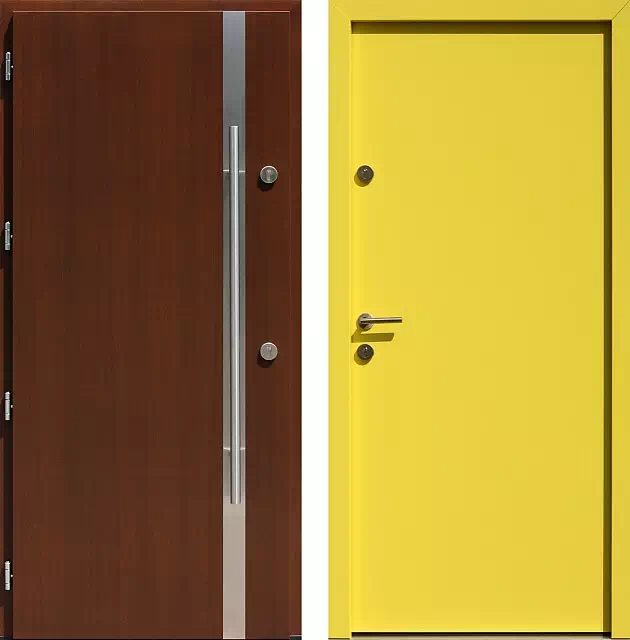 Pochwyt rurowy o przekroju okrągłym i średnicy 32 mm zastosowany na tym przykładowym modelu ma długość 120 cm.Alternatywnie drzwi mogą być wyposażone w pochwyt jedno lub dwustronny o długości od 30 do 200 cm i o przekroju: kwadratowym, prostokątnym i tzw owalnym. Styl tego modelu drzwi zewnętrznych skłania do zastosowania klamek ze szlachetnej, szczotkowanej stali nierdzewnej. Drzwi przeznaczone do zabudowy w domach jednorodzinnych, mieszkaniach i budynkach użyteczności publicznej. Powyższy, przykładowy egzemplarz drzwi zewnętrznych został wymalowany na kolor: orzech + żółte.