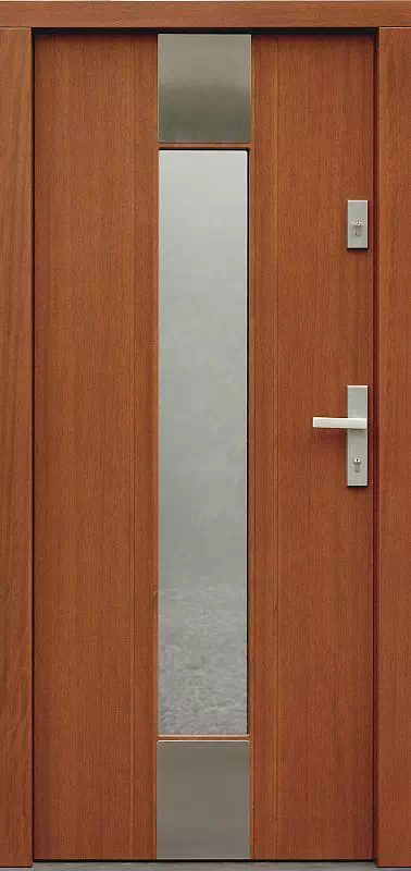 Ten model drzwi występuje w dwu wersjach: z blachą po jednej, oraz po obu stronach skrzydła drzwiowego. Powyższy, przykładowy egzemplarz drzwi zewnętrznych został wymalowany na kolor: ciemny dab.