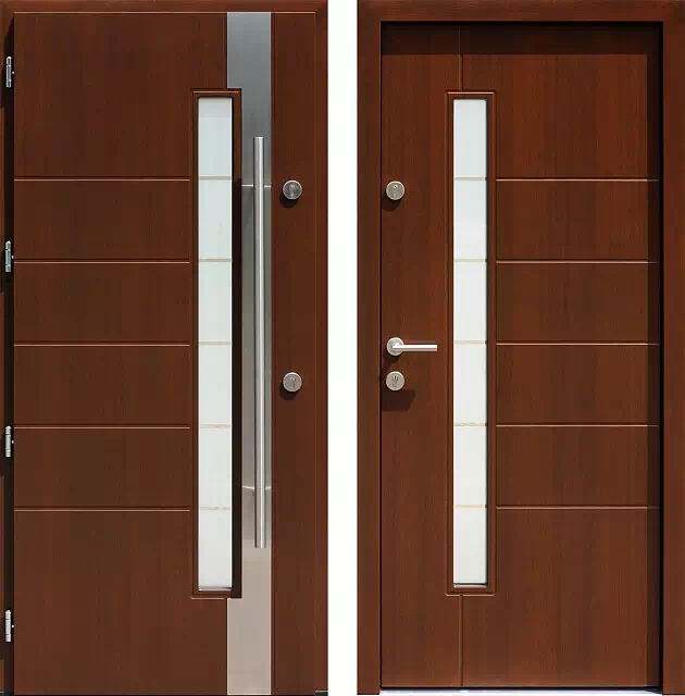 Wzór charakteryzuje się lustrzano-przeziernymi paskami na przedłużeniu poziomych przefrezowań na skrzydłe drzwiowym. Powyższy, przykładowy egzemplarz drzwi zewnętrznych został wymalowany na kolor: orzech.