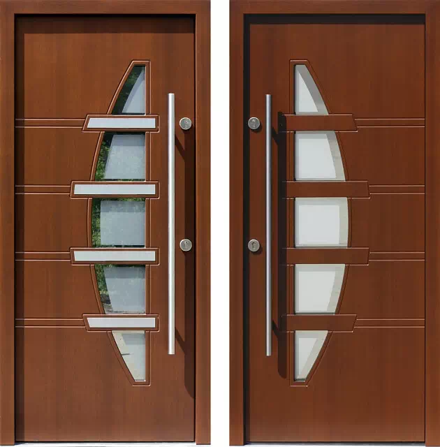 Wzór szyby może być dowolnie zmodyfikowany - zwykle bez dopłat. Powyższy, przykładowy egzemplarz drzwi zewnętrznych został wymalowany na kolor: orzech.